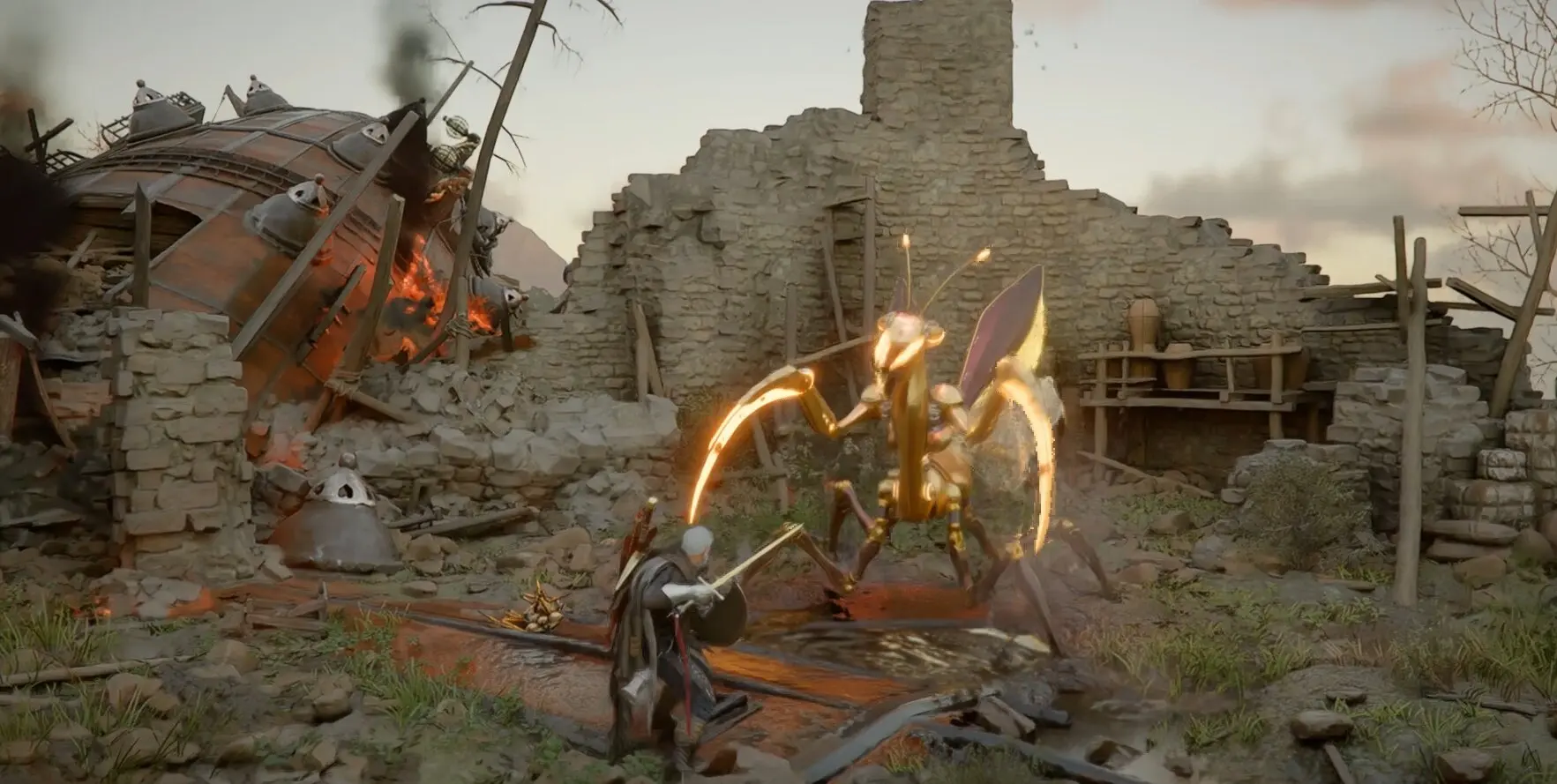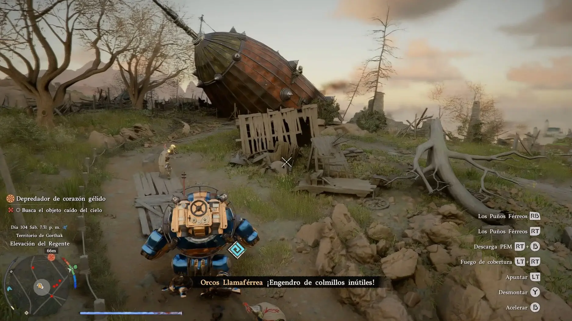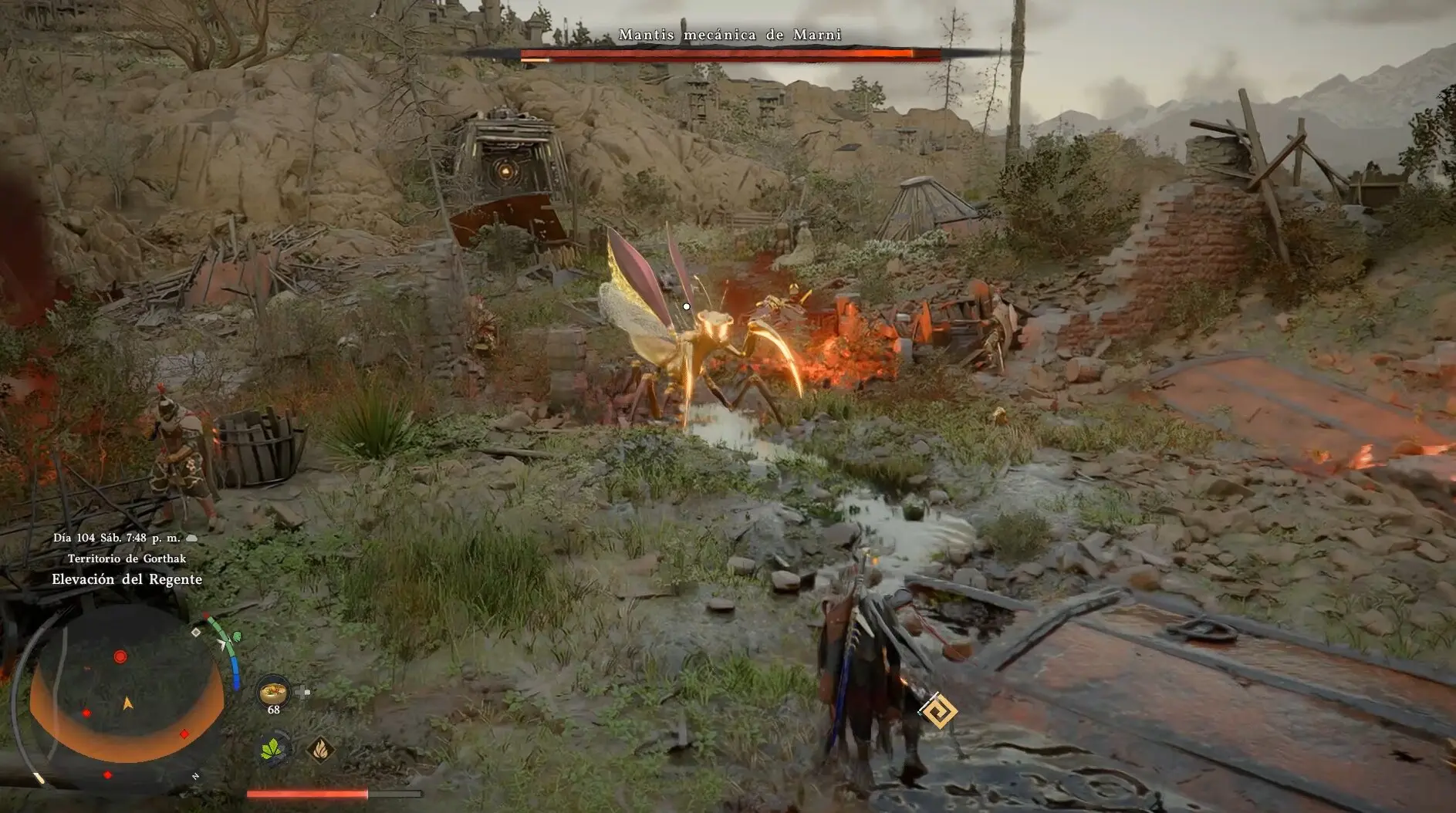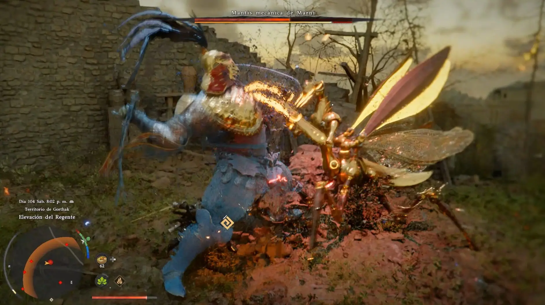 La Mantis Mecánica, conocida en la misión como Depredadora de Corazón Helado, es un arma de guerra con forma de mantis gigante que cae de los restos de un galeón volador al norte de Gorthak, en la región de Delesyia, durante el Capítulo 10. Es una bocanada de aire fresco después del gauntlet del Capítulo 9: solo tiene una barra de vida, sus ataques cuerpo a cuerpo son fáciles de esquivar y la estrategia es mucho más directa que todo lo que has enfrentado hasta ahora. El único peligro real son sus láseres amarillos, que pueden matarte de un golpe si te los tragas sin esquivar.