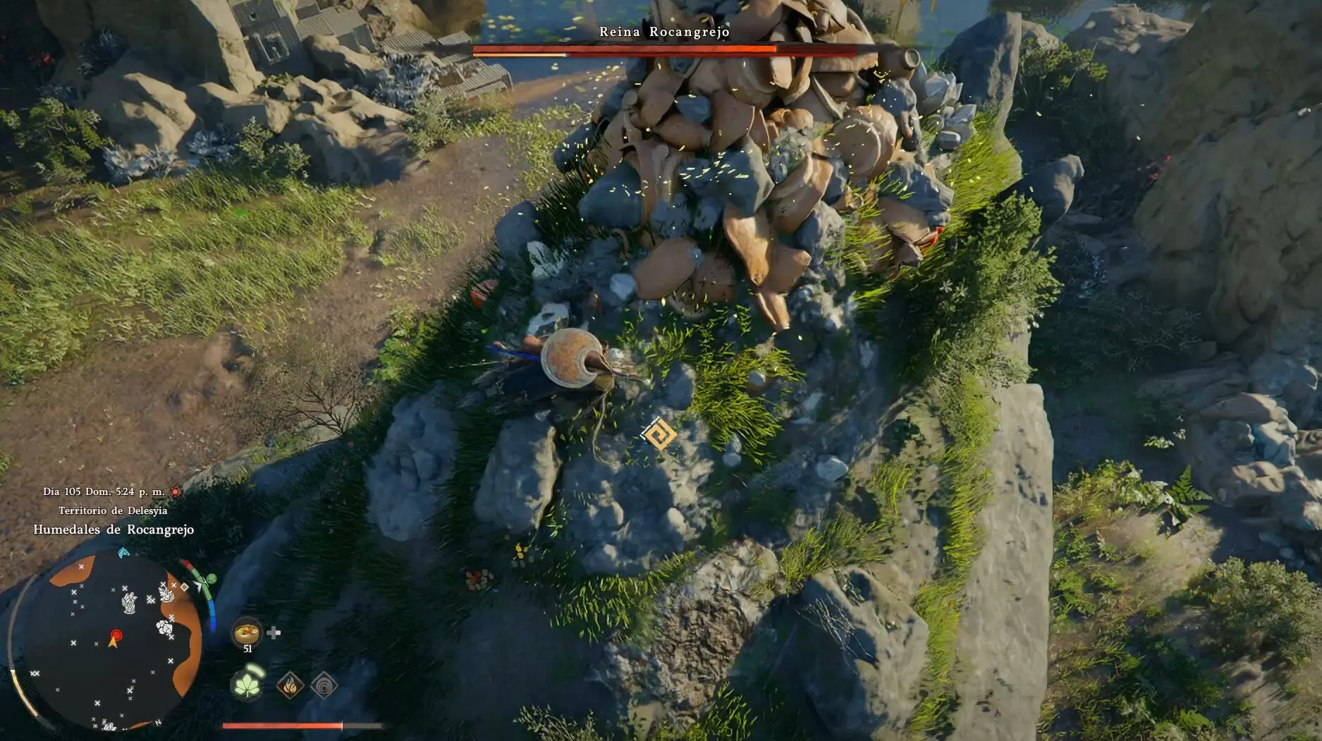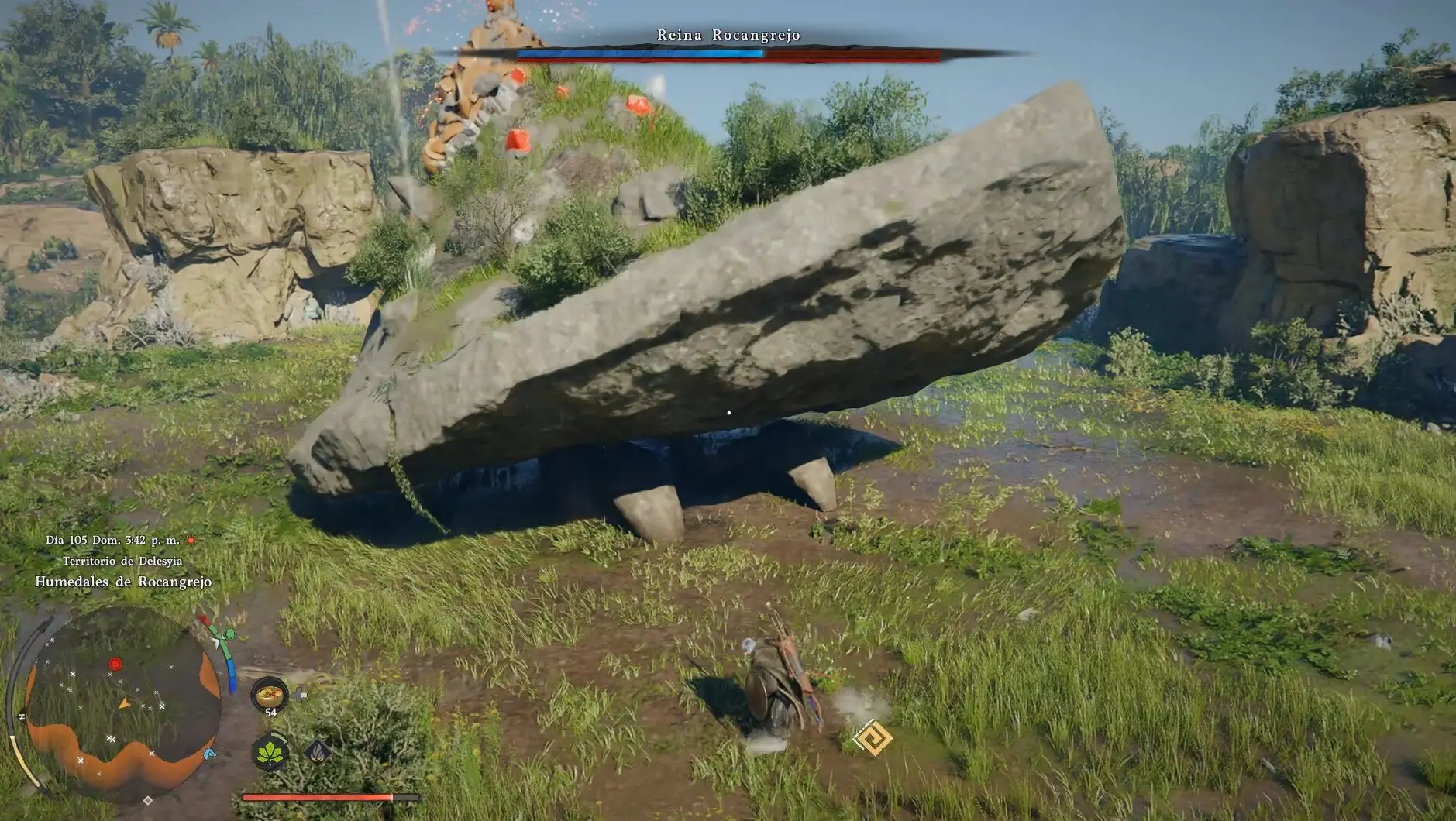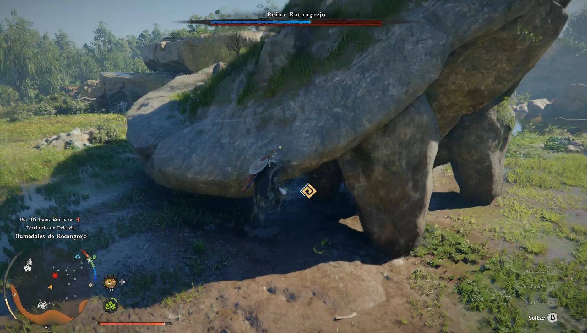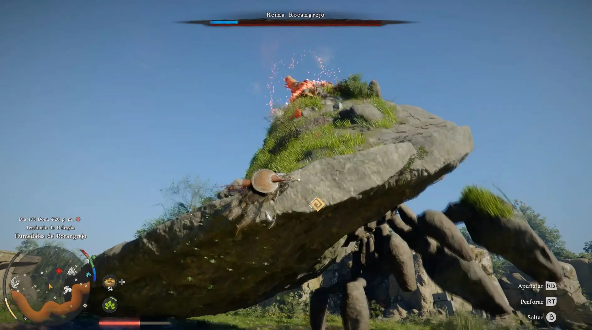 La Reina Rocangrejo es uno de los combates más originales y espectaculares de Crimson Desert y también uno de los que más confunde a los jugadores que intentan afrontarlo como un jefe normal. Olvidate de atacar desde el suelo: el daño convencional no funciona aquí. Este combate es un puzle de escalada al estilo Shadow of the Colossus donde tienes que trepar al lomo de la criatura, localizar sus puntos débiles y destruirlos en orden antes de rematar con la jarra mágica que la controla. Si sabes lo que tienes que hacer, el combate es muy manejable. Si no, puedes estar dando vueltas alrededor de ella durante horas sin hacerle nada.