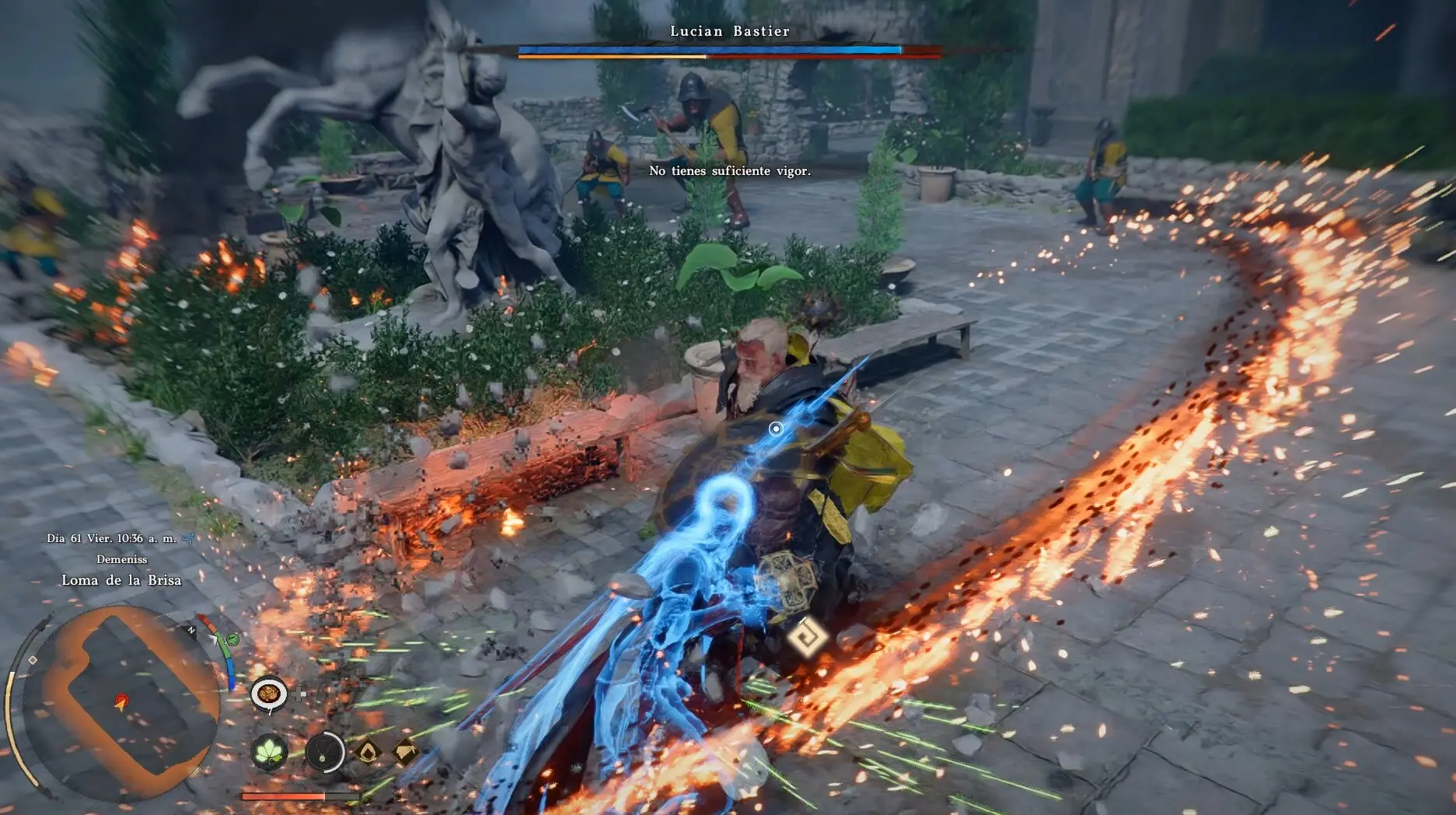 Esquiva lateral en círculo grande, nunca hacia atrás en línea recta. Bastier bloquea los ataques frontales y castiga el retroceso directo. La esquiva diagonal o circular te lleva a su espalda donde es vulnerable. No intentes bloquear: Damiane no tiene la misma disciplina defensiva que Kliff con escudo. La esquiva es siempre más segura. Golpea rápido y retrocede: dos o tres ataques de lanza y fuera. No encadenes combos largos.