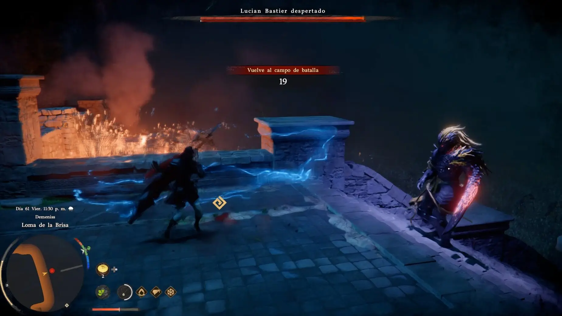 Bastier pelea con maza y escudo y sus ataques infligen daño de fuego que deja manchas en el suelo que persisten varios segundos. Es la fase más manejable de las dos, pero no te confíes: sus combos son rápidos y el daño de fuego acumulado puede pillarte desprevenido.