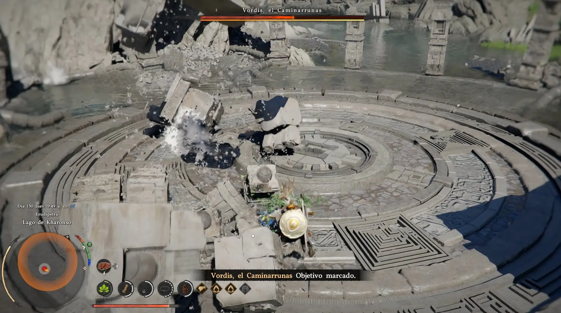 Vordis, el Caminarrunas es un colosal constructo de piedra que duerme en el fondo del Lago de Kharonso, en la región de Erudipetra, y que solo puede ser invocado completando el puzle de las piedras barrera. No lo encontrarás merodeando por el mundo: hay que ganárselo. Una vez convocado el combate funciona de forma muy similar a Lithus, porque también tiene un punto débil en la cabeza que hay que arrancar con la Fuerza Axioma para dejarle expuesto. Si ya has pasado por Lithus, este combate te resultará familiar.
