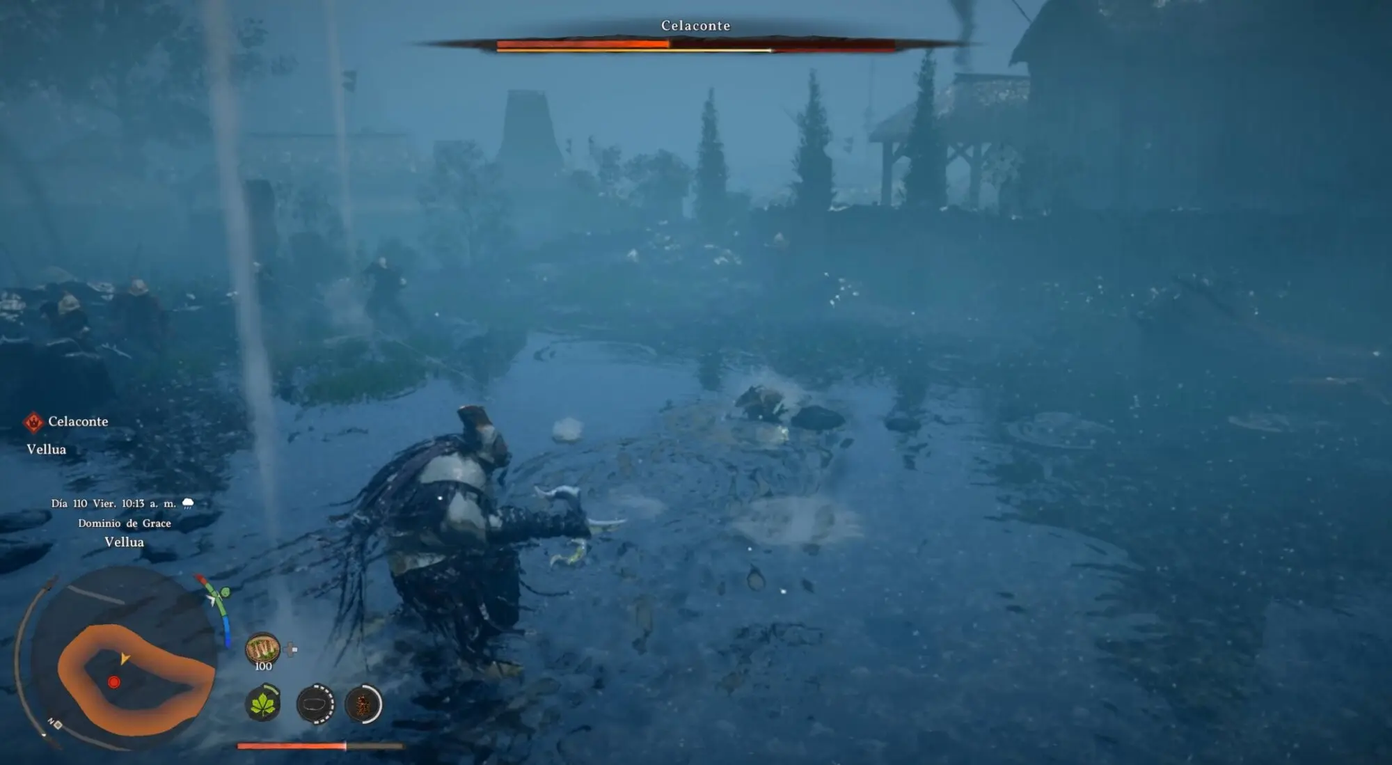 El Celaconte tiene una sola barra de vida. El combate transcurre en una zona inundada con visibilidad reducida, lo que puede dificultar leer sus movimientos. La estrategia universal funciona aquí: ataques rápidos encadenados, esquiva cuando cargue y cura con comida sin parar de atacar. No intentes bloquearlo a lo bruto porque su armadura le da mucho peso en los golpes.
