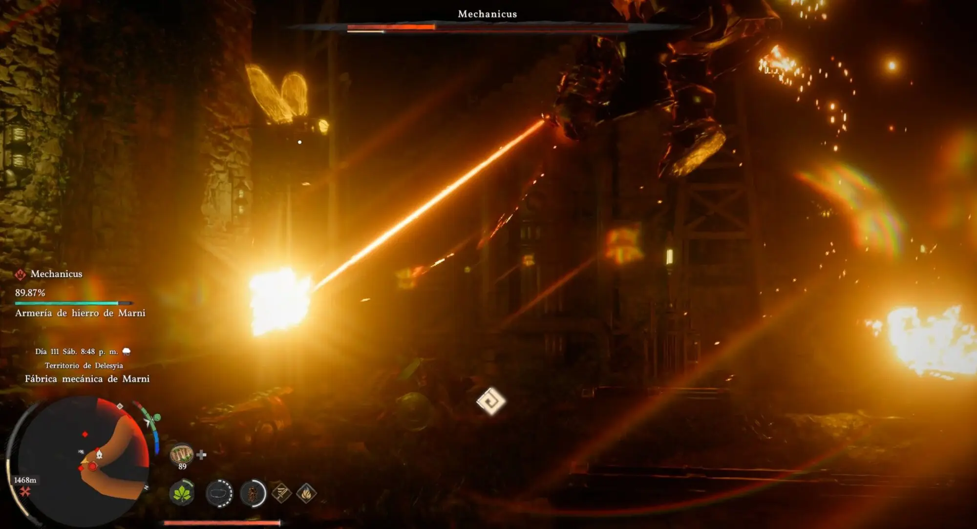 El Mechanicus tiene una sola barra de vida y es una versión reforzada de los guardianes de hierro que patrullan la ciudad. Su ataque más peligroso con diferencia es el láser amarillo que dispara desde el ojo: hace una barbaridad de daño y puede sorprenderte si no lo tienes controlado. La clave para esquivarlo es moverse en círculo alrededor de él constantemente, lo que hace que el láser sea muy fácil de evitar porque la máquina gira lento.