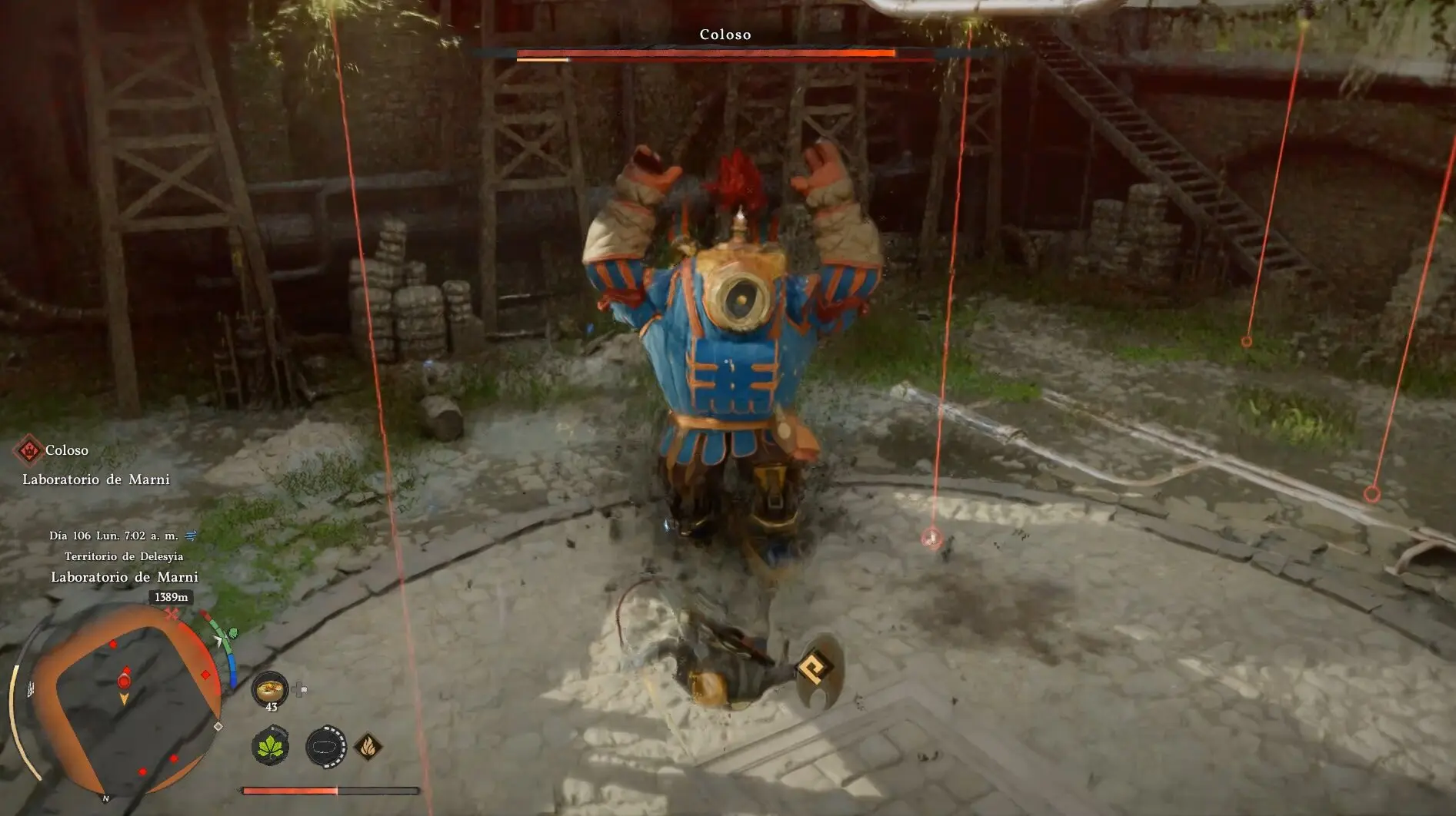 El Coloso es más directo que los dos tanques: esquiva su combo de tres golpes, entra con ataques pesados durante su recuperación y retrocede. El láser amarillo es lo único que requiere atención real: en cuanto veas el ojo iluminarse empieza a moverte en círculo y no pares hasta que termine. Fuera de eso es un combate de paciencia estándar.