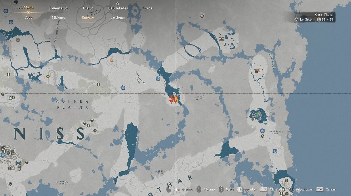 Paso 1: Abre el mapa y pulsa el botón correspondiente para cambiar al mapa del Abismo (mapa aéreo). Localiza el Anillo Triangular en el centro del mapa y viaja rápido al Nido del Cuervo, donde derrotaste a Invocacuervos al final del Capítulo 5.