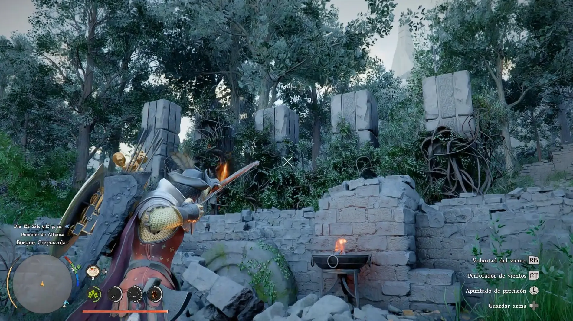 Limpiar la maleza Antes de poder interactuar con el dispositivo, tienes que quemar las raíces que cubren tanto los pilares como el mecanismo central. Usa la habilidad de concentrar luz (Destello Cegador) para eliminarlas