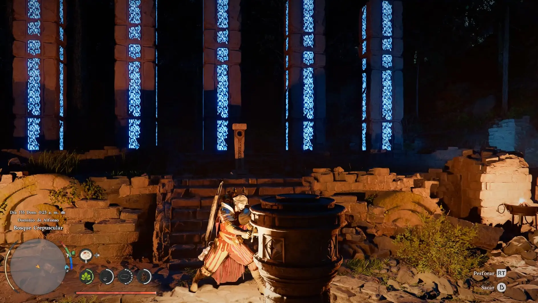 El dispositivo central tiene cuatro agujeros en sus lados. Para activar cada agujero, clava la espada con R1 + Triángulo (PlayStation) o RB + Y (Xbox). Cada agujero mueve un grupo diferente de pilares: