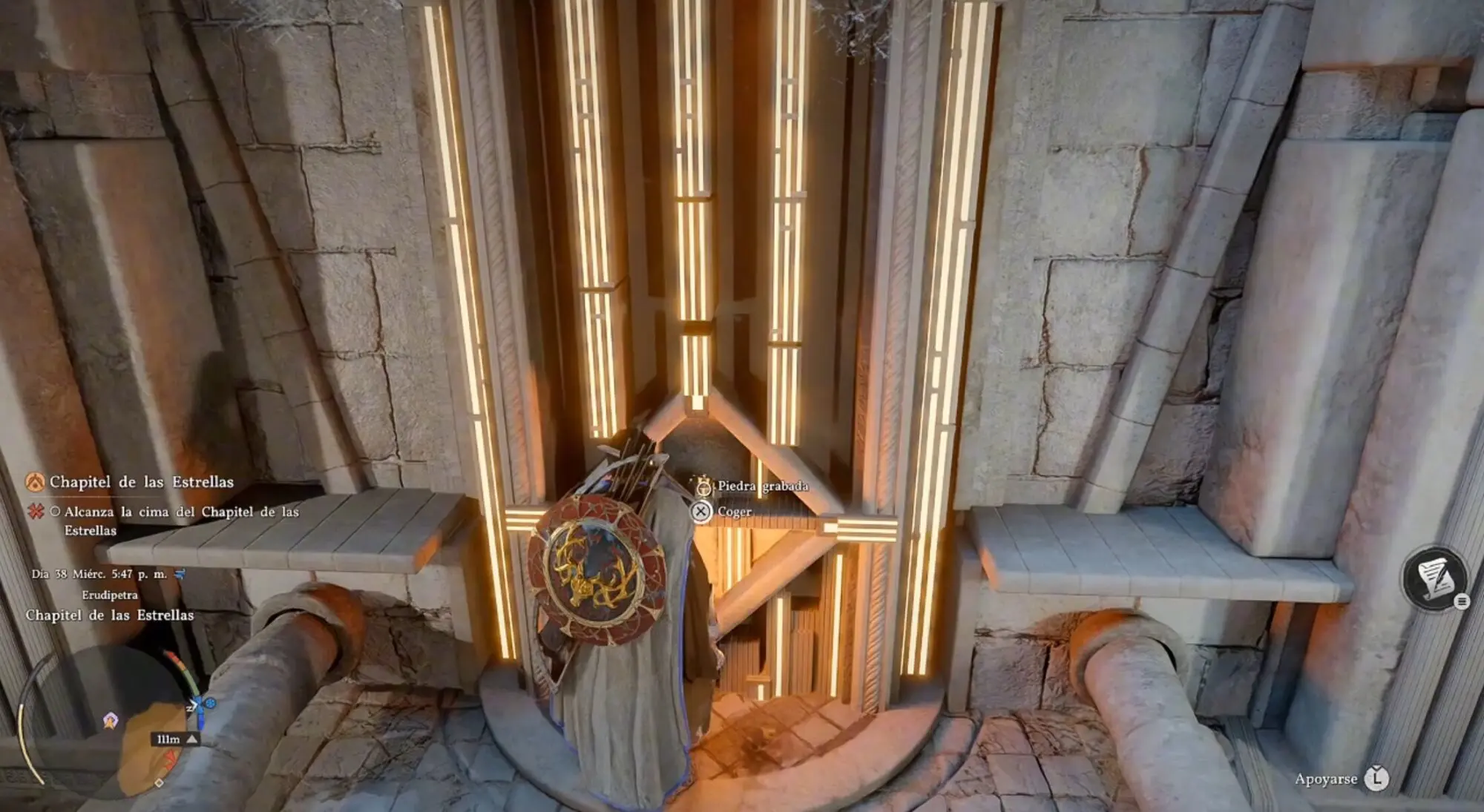 | Triángulo (△) | Posición 3 | Inserta la última Piedra Grabada, escala la palanca pero salta ANTES de llegar abajo. Suéltate cuando el símbolo llegue a la posición 3 (segunda desde abajo) |