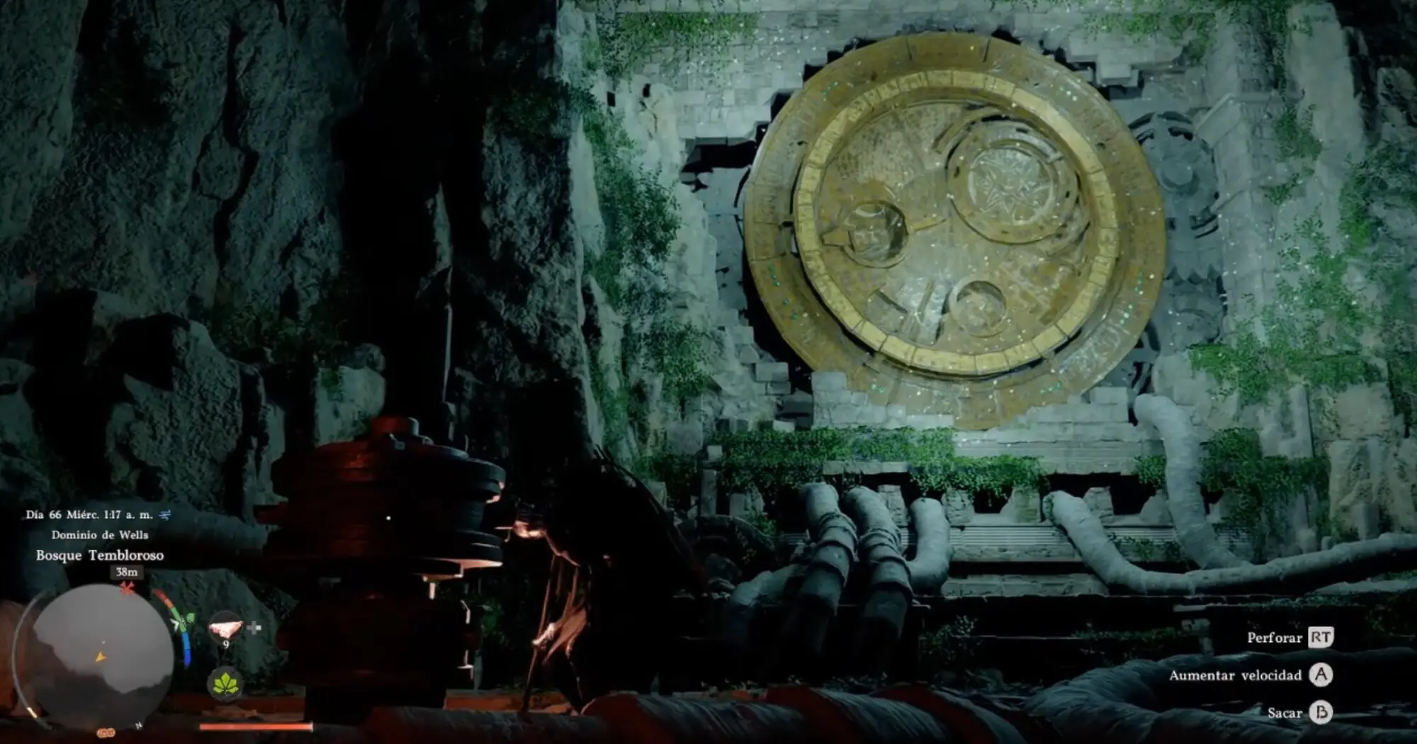 | Izquierda | Los dos círculos metálicos pequeños exteriores (luna y pez) | Rota: las asas están rotas. Necesitas usar la Estocada para clavar tu espada y girarla |