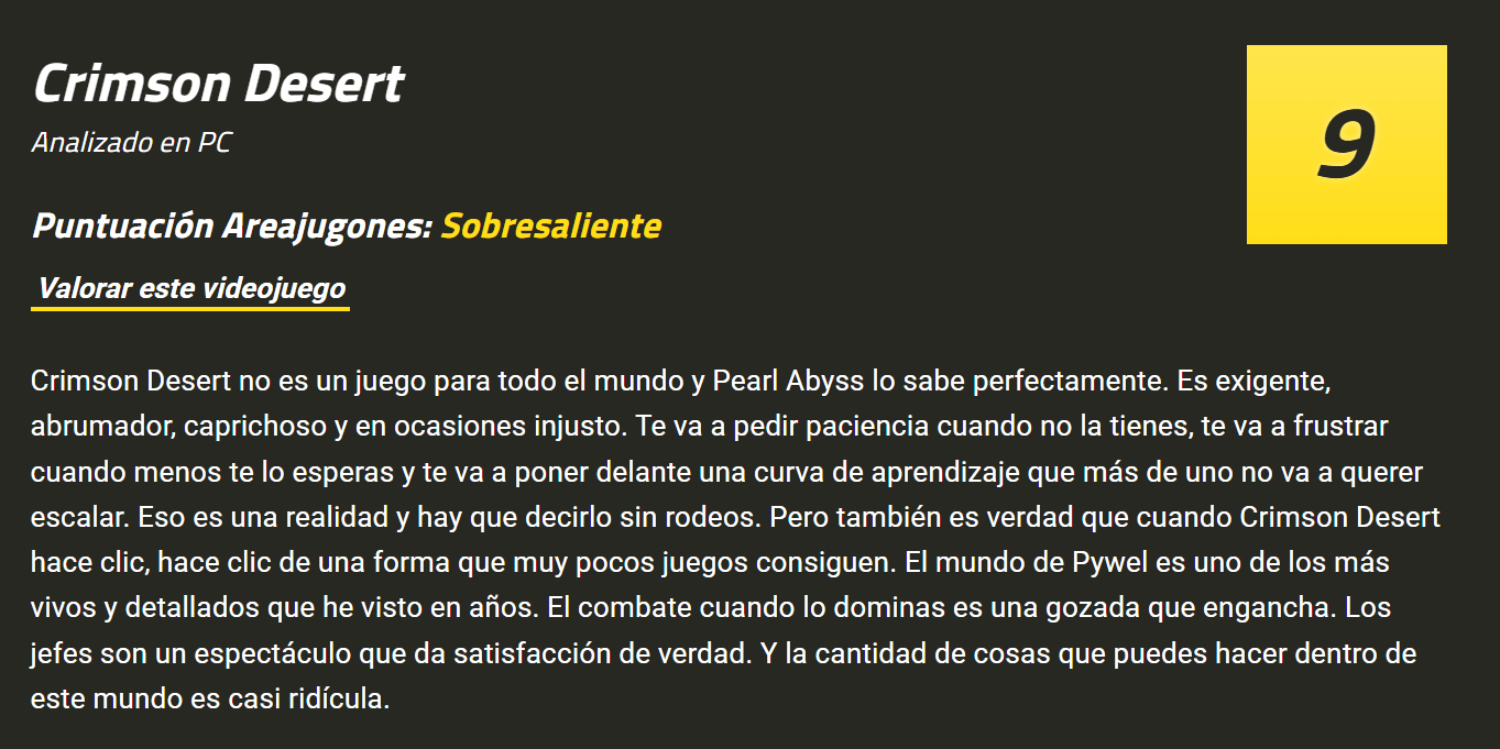 ¿Qué nota le hemos puesto a Crimson Desert en Areajugones?