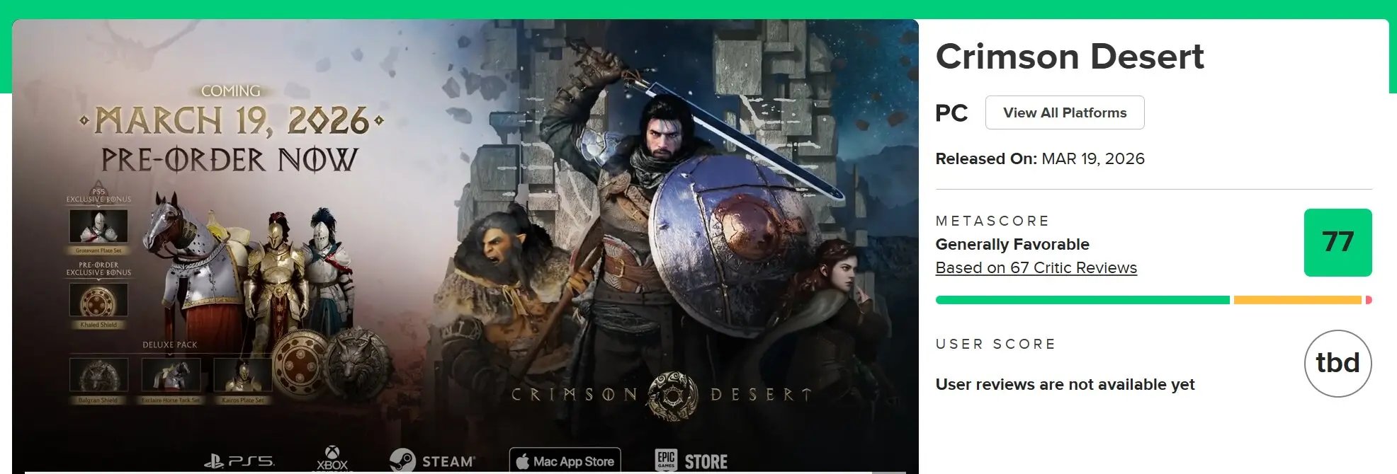 • Crimson Desert ha logrado una nota de 77 sobre 100 en Metacritic por parte de la prensa especializada.