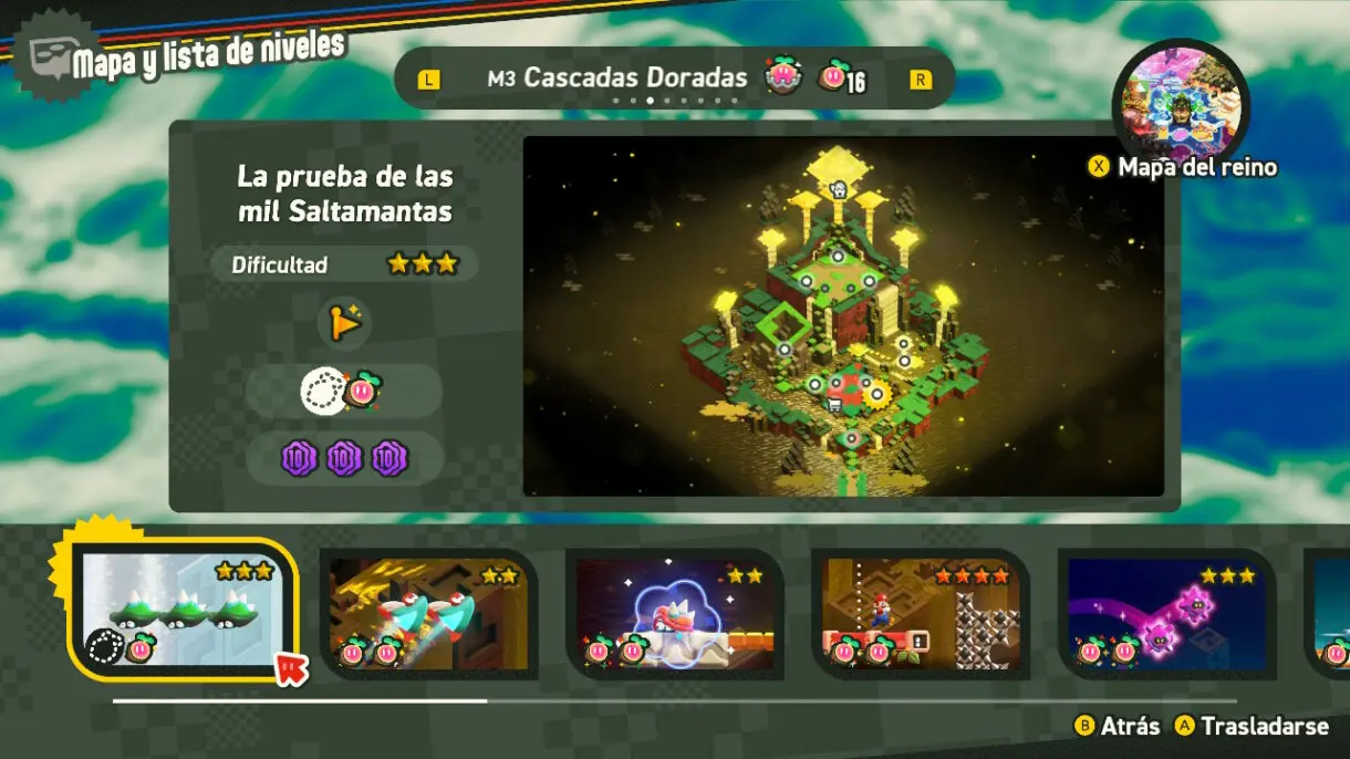 El tercer mundo de Super Mario Bros. Wonder es algo más corto que los dos primeros, pero también es uno de los que tienen más encanto. En este lugar, casi todo está recubierto de oro y brilla con una fuerza especial. Es ese punto del juego en el que las cosas no se han puesto complicadas aún, pero la dificultad empieza a subir un poquito.