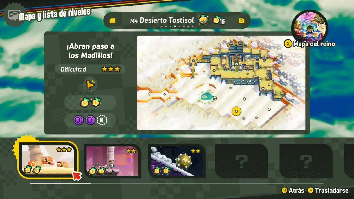 Se trata del típico mundo desértico que hay en todos los juegos de Super Mario en 2D, pero este cuenta con unos giros que lo alejan de aquello a lo que estamos acostumbrados. Se trata de un lugar donde hay muchos niveles ocultos a simple vista y dónde es muy fácil que pases por alto bastantes de ellos si no prestas la suficiente atención.