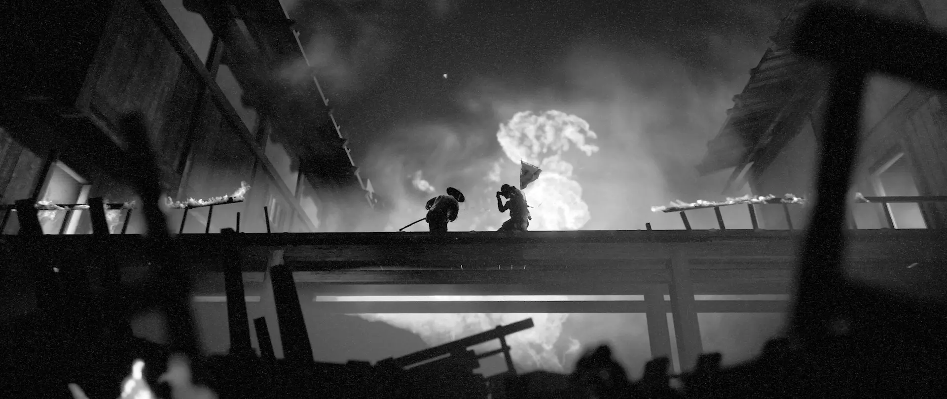 Si Ghost of Tsushima fue un homenaje, Trek to Yomi es la ofrenda completa. Su estética en blanco y negro, su montaje cinematográfico y su ambientación minimalista evocan directamente el cine de samuráis clásico. Cada plano parece cuidadosamente diseñado para rendir tributo al lenguaje visual de los años 50.
