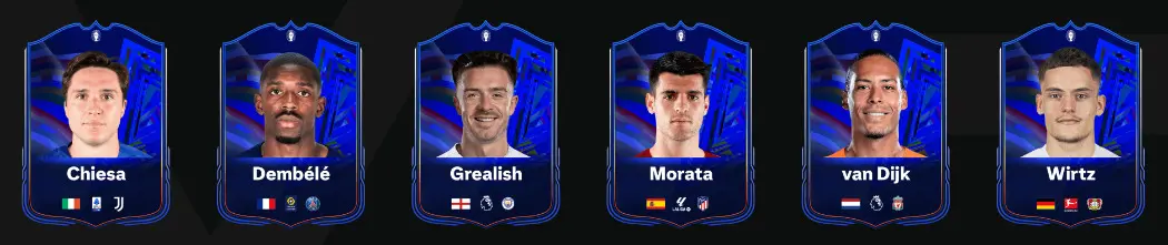 Según podemos ver desde la propia web de la compañía, tendremos la opción de conseguir un tipo de carta azulada. Y parece que los seis futbolistas disponibles serían Federico Chiesa, Ousmane Dembélé, Jack Grealish, Álvaro Morata, Virgil van Dijk y Florian Wirtz. Sin embargo, no han mostrado cuáles serían las medias y estadísticas de cada uno. Solo el diseño de los ítems.