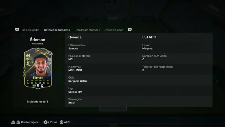 Da la impresión de que pronto veremos una nueva carta relacionada con la final de la UEFA Europa League, pero por el momento ese partido ya ha supuesto la actualización de Éderson Showdown en EA Sports FC 24. El mediocentro brasileño ha sido quien mejoró en vez de Hofmann, y así luce actualmente.