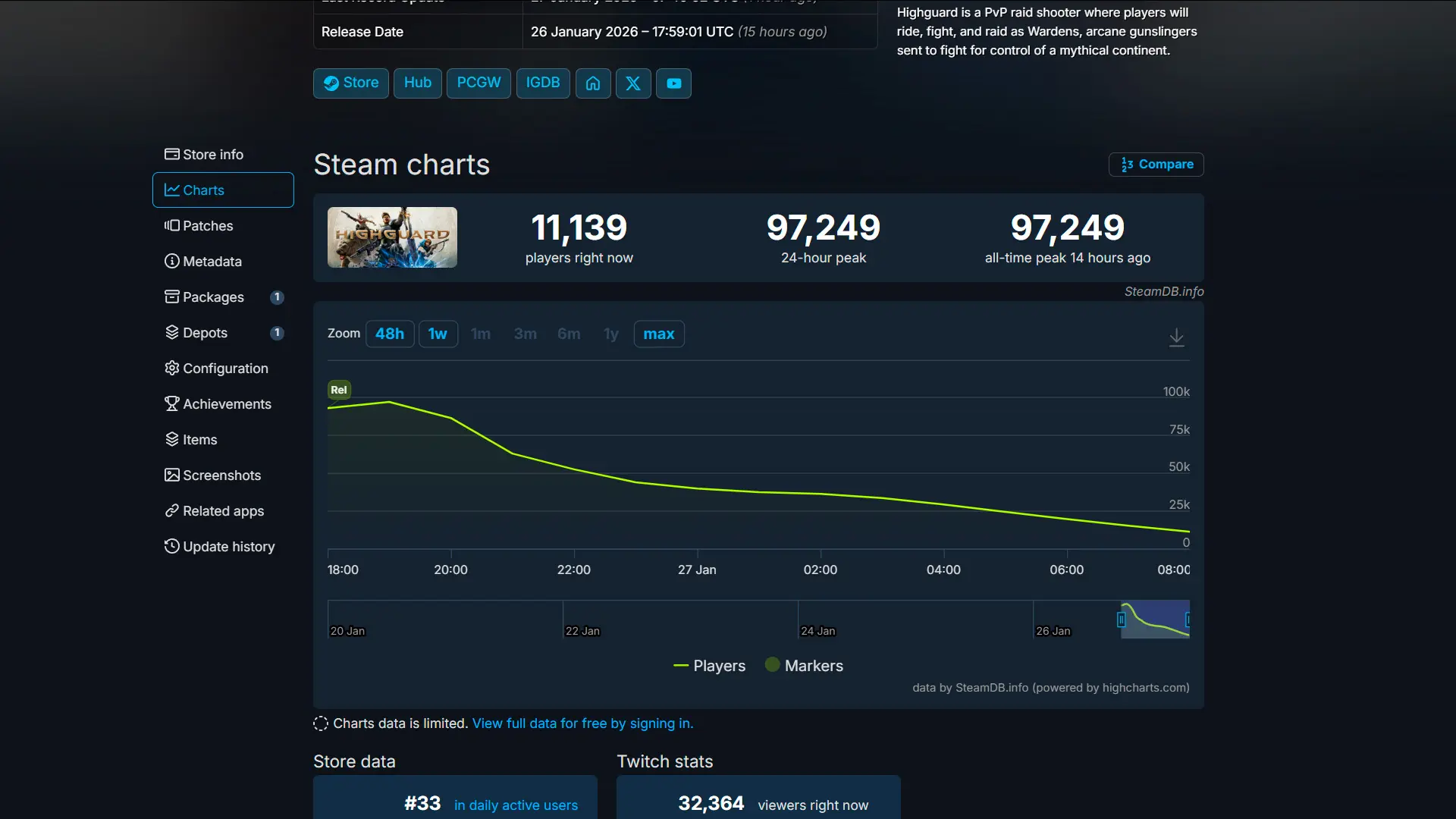 El primer punto en el que tenemos que fijarnos es en la cantidad de jugadores que Highhuard ha logrado retener desde que salió el 26 de enero. En este sentido, y según los datos ofrecidos por SteamDB, el juego llegó a alcanzar un pico máximo de casi 100.000 jugadores, pero esta cifra ha llegado a desplomarse hasta los 11.000.