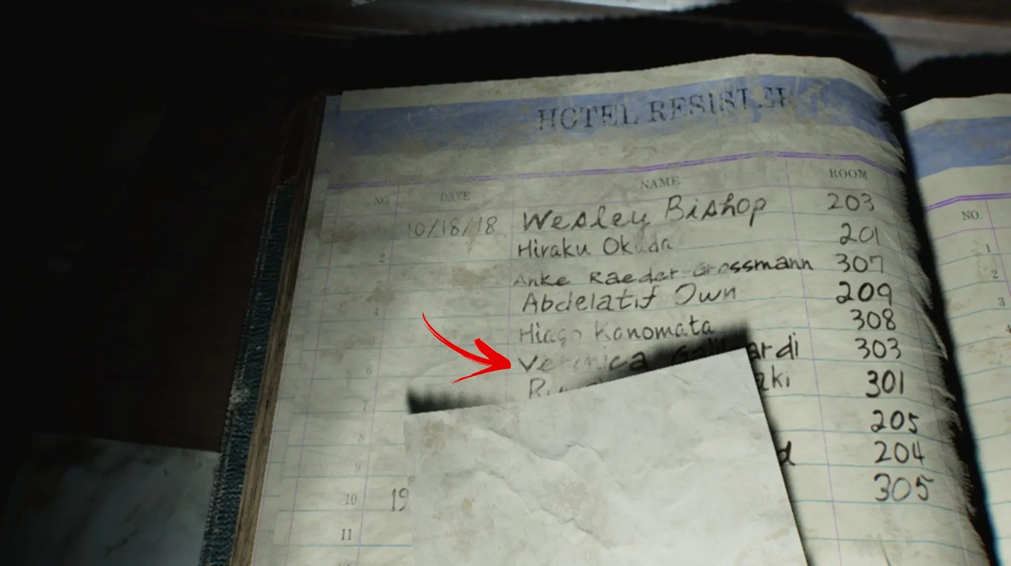 La segunda pista fue compartida por el usuario Resident Leo., quien utilizó el modo foto del juego para leer el registro del hotel Wrenwood. En él, se puede observar que Alyssa no fue la última huésped del establecimiento, sino que hubo otra persona más que recibía el nombre de Verónica. Algo que muchos sostienen como otra referencia más a un posible remake de Resident Evil: Code Veronica en el futuro. Os dejo con la imagen a continuación.