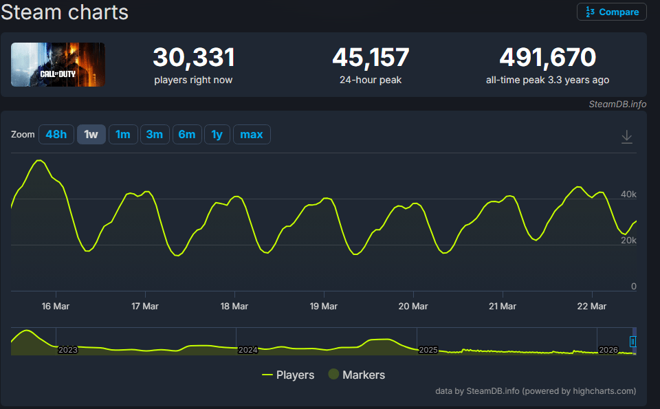 Aunque hoy vengo a traeros una oferta del que para muchos, ha sido el útlimo "buen CoD", el que dió comienzo a la nueva era y que si bien tampoco es perfecto, considero que tiene mejores cosas buenas que el Call of Duty actual. Para nuestra sorpresa, Activision ha reventado su precio en Steam, lo que ha provocado que muchos jugadores le den una oportunidad y para sorpresa nuestra, ha acabado superando en jugadores a Black Ops 7, el actual juego.