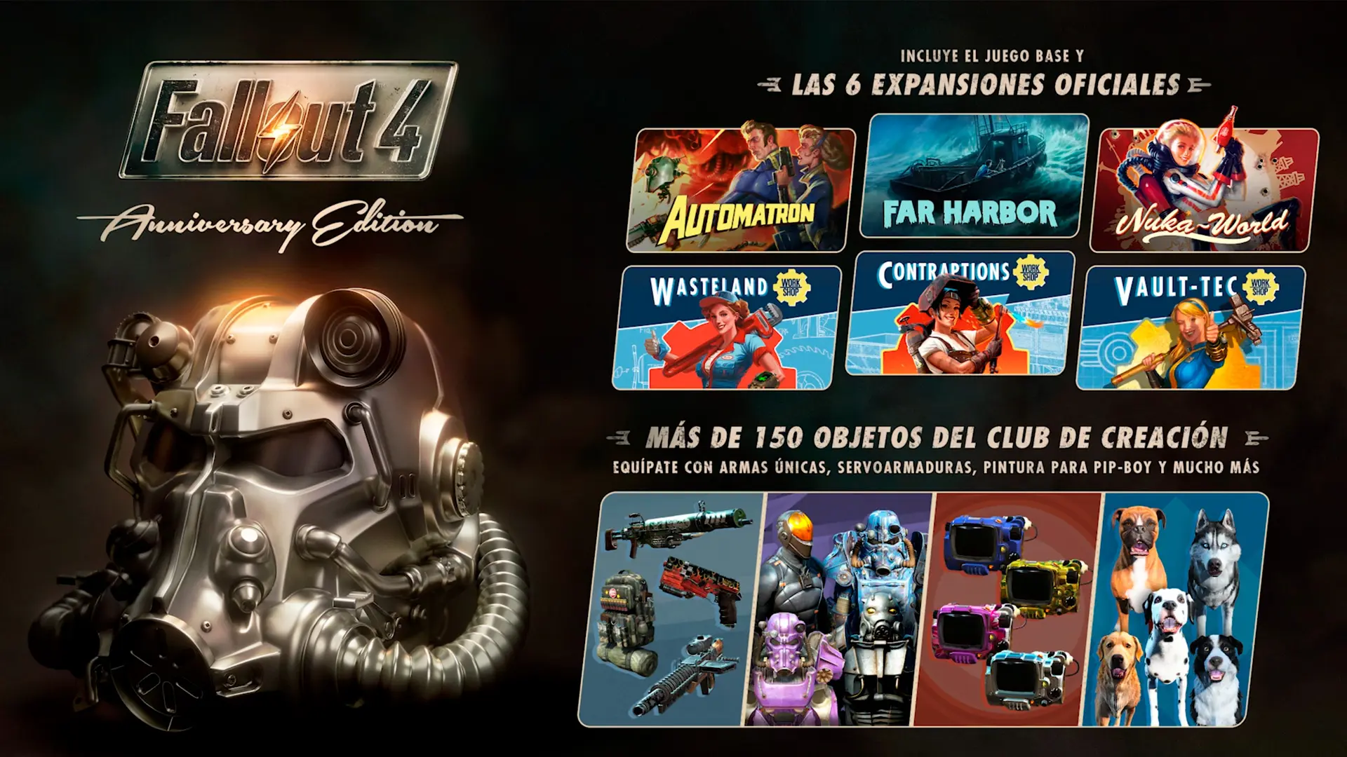 Además de traer consigo el juego base, la Annyversary Edition contiene todas las expansiones oficiales lanzadas por Bethesda de Fallout 4. Esto implica que, a un juego que ya de por sí dura unas 70-100 horas para completar todo el contenido que contiene, habrá que sumarle otras 50 más si queremos pasarnos estos DLCs. Aquí abajo os dejo con la lista de los mismos: