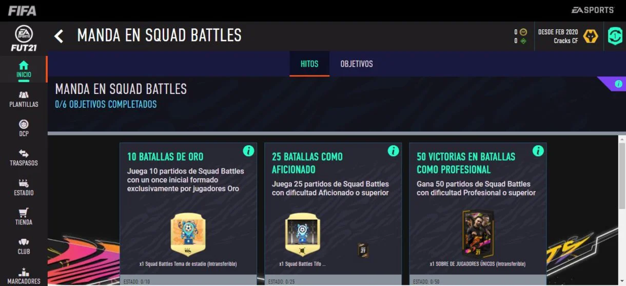 10 batallas de oro: Juega 10 partidos de Squad Battles con un once inicial formado exclusivamente por jugadores Oro. Recompensa: Tema de estadio (Squad Battles).