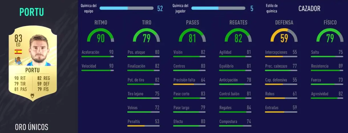 Carta que ya no destaca como antes pero sigue teniendo números muy decentes. Su gran defecto son las tres estrellas de filigranas, por eso solo lo aconsejamos para aquellas personas que no suelen hacer skills. Aunque si sueles sacar ventaja de movimientos como la croqueta, lo mejor es buscar otras opciones. Portu RTTF es veloz, dispara bien, tiene una conducción de balón aceptable y un interesante 86 en visión. El 94 de stamina le permite correr por banda constantemente, pero queda limitado por su problema con las estrellas, por apenas llegar a tres de filigranas y cuatro en pierna mala.