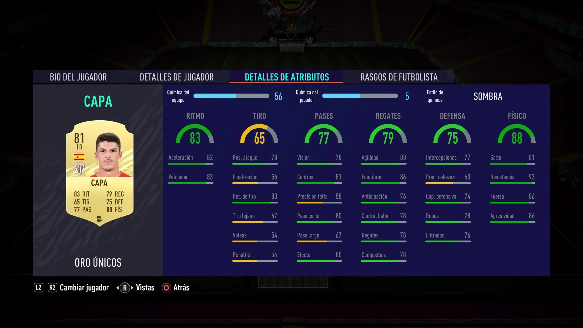 Sí debemos advertir de que es importante usarlo con Sombra. Mejora bastante su rendimiento, y es casi necesario si queremos utilizar a Capa en un equipo de presupuesto medio/alto. Sin el boost de ritmo que proporciona esta química, es normal que sufra con las carreras de los extremos más veloces de FIFA 21.