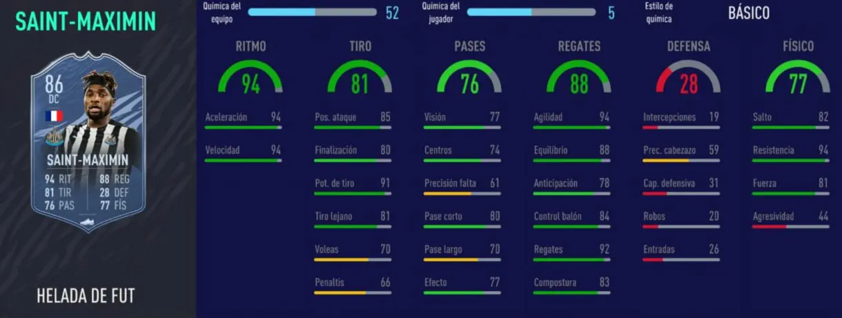 No es una ganga y algunos atributos son bastante bajos actualmente, sobre todo el pase. Pero relación calidad/precio es aceptable porque los delanteros de la Premier League casi siempre son más caros de lo que deberían. Si sois muy hábiles con las cinco de filigranas, aún es una carta competitiva. Al tener 94 de ritmo, podemos usarlo con químicas como Rematador o Tirador Preciso. No destacará en los contraataques, pero sí sabrá generar sus propias ocasiones cuando ataquemos en estático. El 94 de stamina es muy positivo y las estadísticas de disparo no quedan mal con el estilo. Sus grandes debilidades son la visión (77) y el pase en corto (80).