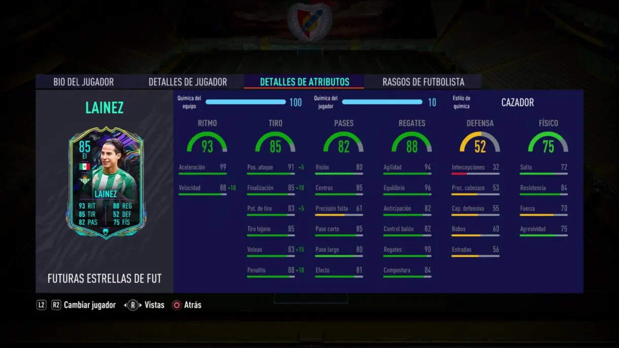 Lainez Future Stars será explosivo en la arrancada con cualquier química. Es el típico extremo de baja altura (1'68) muy habilidoso por su aceleración perfecta, y porque cuenta con unos números sobresalientes de agilidad (94), balance (96) y dribling (90). Gracias a ellos, aprovechará bastante bien sus cuatro estrellas de filigranas. Pese a que los atributos de reacción (82) y control de balón (82) no son espectaculares, se siente bastante fino con la pelota. Más aún si juega con Rematador o Tirador Preciso.