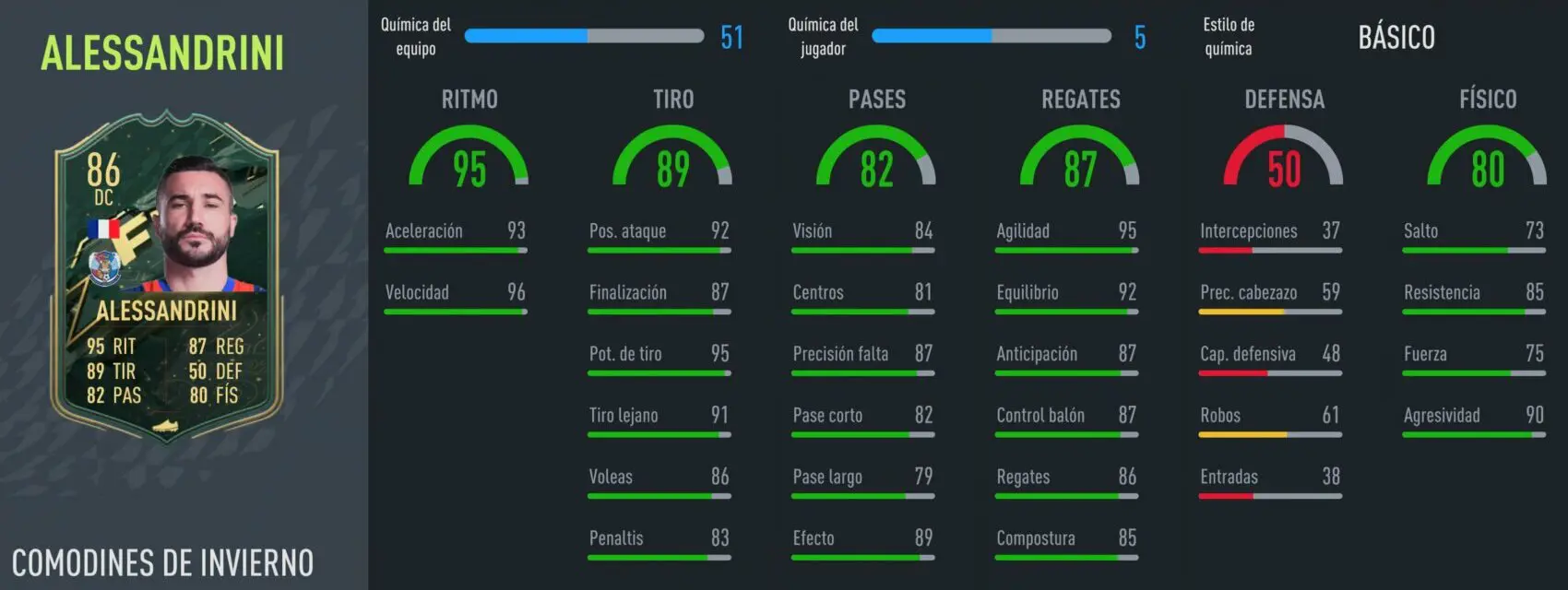 Su 92 de aceleración, el 95 en sprint y su 86 de intercepción nos permiten aplicar Ancla como química. Así llega al 92 en fuerza (una locura en esta época de FIFA 22), su ritmo es casi perfecto y en el uno contra uno lo sentimos contundente porque también mide 1'80. Es alguien seguro en cualquier tipo de acción defensiva y que no debe temer a ningún delantero de Ultimate Team.