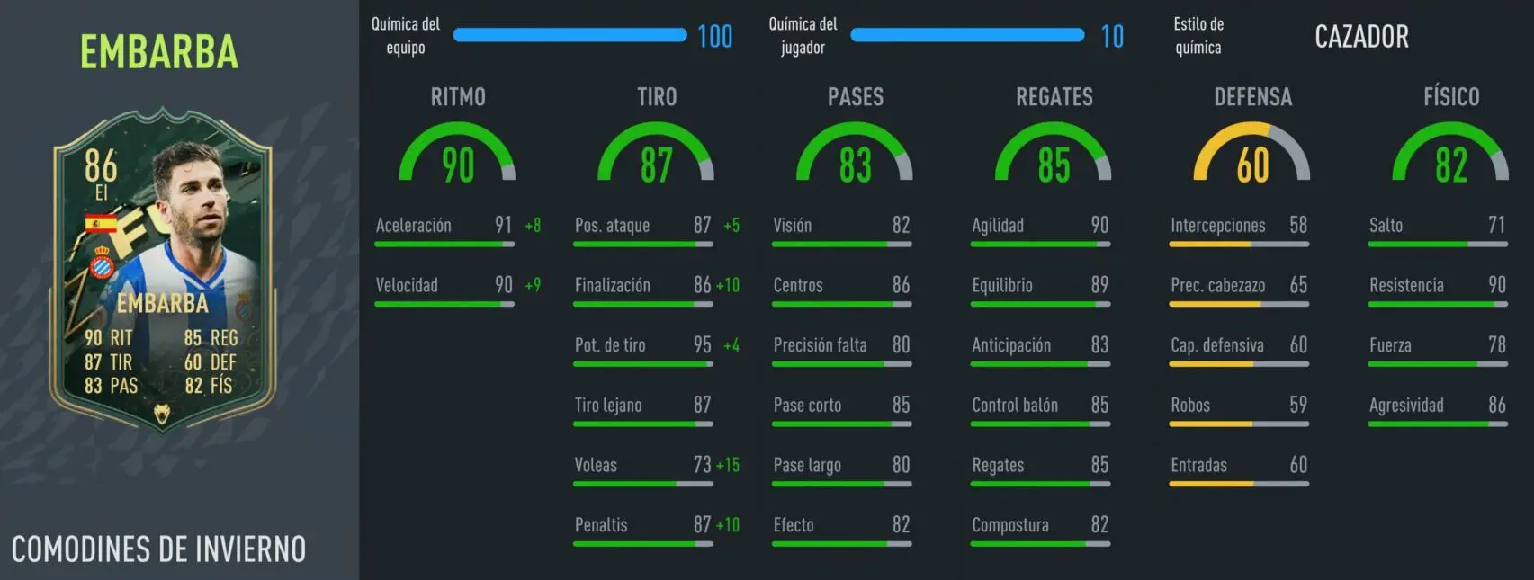 Su aspecto más mejorable es el 82 de visión, nos encantaría que tuviese alguno puntos extra para que fuese aún más preciso con los envíos al espacio. También es cierto que su 78 en fuerza parece un poco más bajo porque mide 1'73, pero ni mucho menos es un jugador endeble que caiga con facilidad. Y como sus estadísticas de regate son bastante buenas, podemos usarlo constantemente para avanzar por banda. Además de que el 90 en resistencia le permite soportar ese esfuerzo físico, y dentro del área suele acertar por sus buenos atributos de disparo. Así que es otro futbolista muy usable, sin carencias graves y bastante asequible.