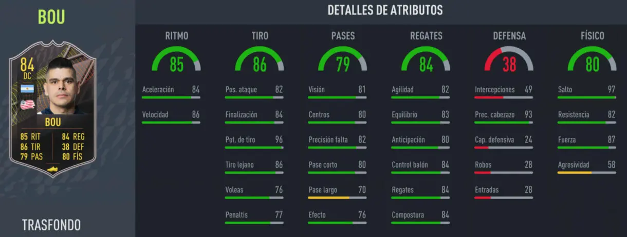 Gustavo Bou Trasfondo aparenta ser el clásico atacante completo que no llega al sobresaliente en casi nada, pero sí es notable en todos los aspectos importantes para su posición. Un 84 de aceleración y 86 en sprint no es impresionante, aunque está muy bien y con Cazador debería subir su 84 de finalización a 94. Incluso funcionará mejor por la alta potencia de tiro (96), como pasador no desentona y las stats de regate quedan equilibradas. El único riesgo de este delantero es que, por el 87 de fuerza y su 1'78 en altura, quizá le asignen un Body Type que lo haga más torpe. Pero no sería un problema si mantiene el tipo de cuerpo del año pasado.