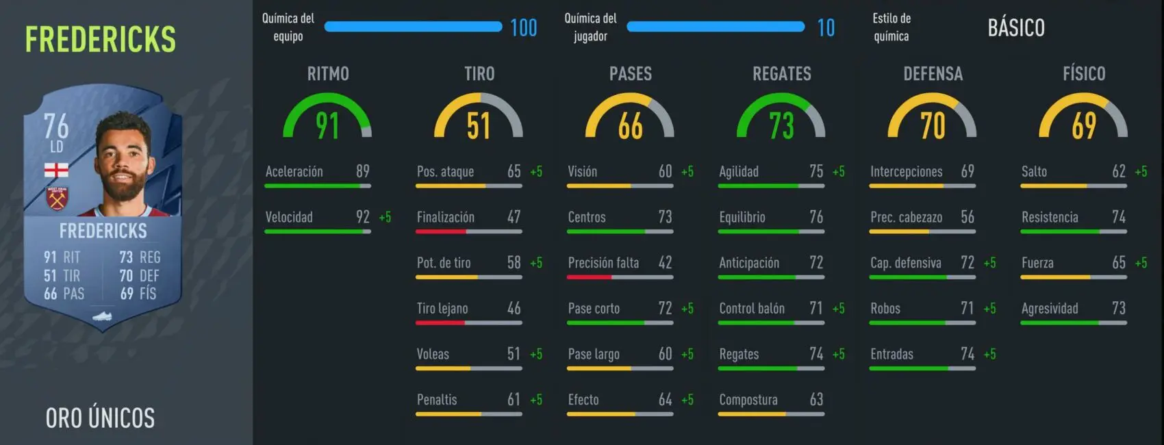 Su calidad es decente pese al bajo precio, los números de pase no están mal y los de regate funcionan mejor por el Body Type "Delgado". Las stats defensivas son correctas y, pese a no destacar en fuerza (65), el ritmo está muy bien y es positivo que quede ligeramente desbalanceado a favor del sprint (87). Es una carta que cumple sin destacar.