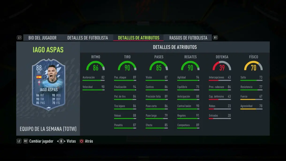 Iago Aspas ha recibido su tercer In Form de la temporada y algunas estadísticas no están nada mal. Aunque sigue teniendo carencias físicas, una aceleración muy mejorable y solo tres estrellas de filigranas. Esta carta podría haber sido útil hace tiempo, pero actualmente encontramos alternativas de bajo coste que son más completas. Quizá no destacan tanto en el pase, pero son menos vulnerables en el cuerpo a cuerpo.