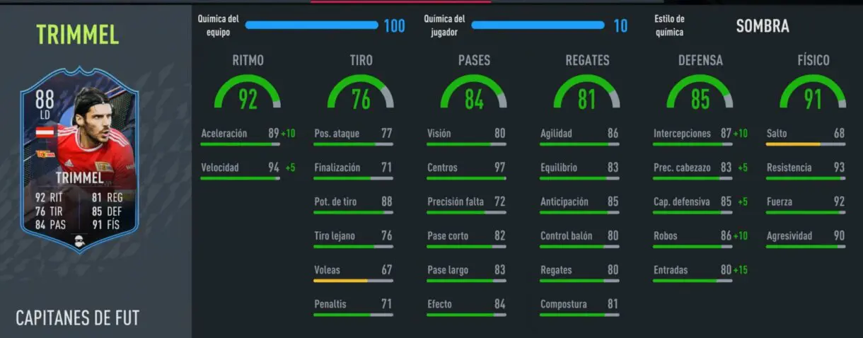 Trimmel FUT Captains es uno de los LD´s más fiables de FIFA 22. Sus atributos defensivos no sorprenden, pero quedan bastante bien con Sombra como química. El ritmo alcanza la perfección y marca la diferencia por sus características físicas. Es un futbolista muy alto y bastante fuerte (92), por eso es tan dominante en el uno contra uno. Sabe desestabilizar a los rivales mediante forcejeos y no es sencillo ganarle en las carreras largas. Así que, si necesitas fiabilidad a un coste bajo, es una carta muy recomendable.