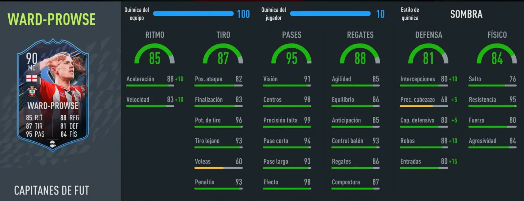 Preferimos a Mark Noble FUT Captains porque, aunque también tiene debilidades claras como el work rate medio/medio, es más seguro atrás gracias a sus estadísticas defensivas y condiciones físicas. Ward-Prowse no es tan fiable en su propio campo porque apenas mide 1'73 y no supera el 80 de inteligencia. Pero si buscas un organizador que sea decente defendiendo, es una opción bastante útil.