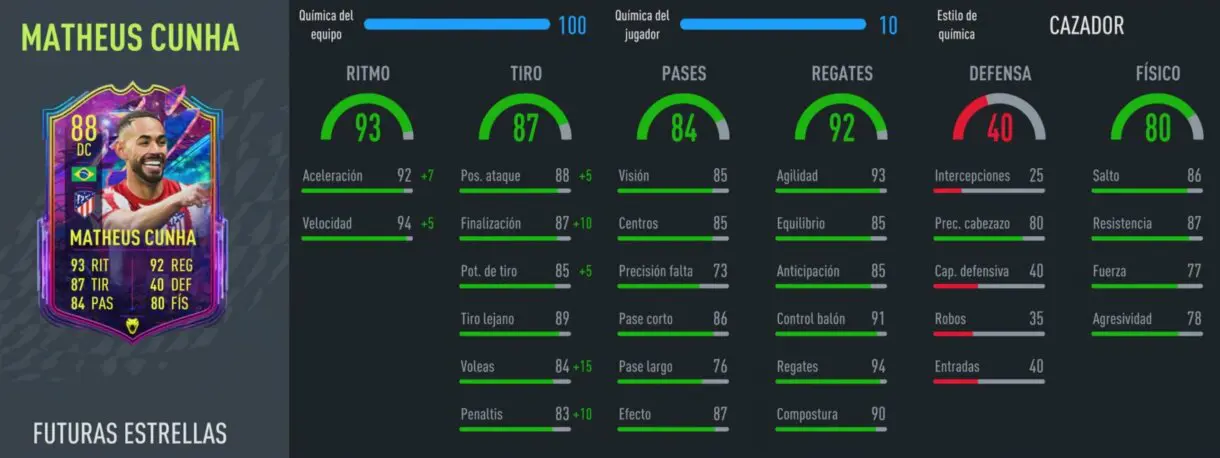 Matheus Cunha Future Stars marca bastantes ocasiones de gol y cuenta con "Tiro con exterior". Pero aprovecharía más su 89 de long shot si tuviese "Disparo de calidad", y sus números en finalización (87) y shot power (85) tampoco sorprenden. Si aplicamos Cazador, la potencia de tiro no queda muy alta. Mientras que con Halcón flojea en la definición. Por eso cumple de cara a portería, pero sin ser increíblemente fiable.