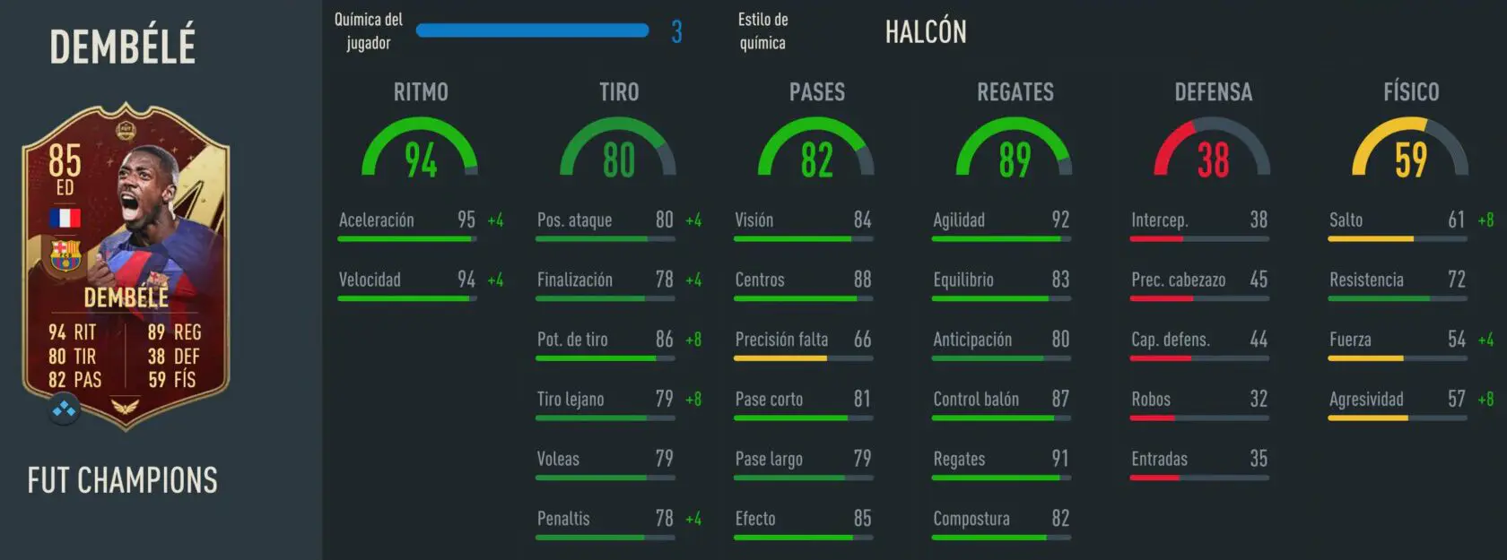 El upgrade respecto a su carta base es importante porque consigue un punto más de velocidad para sentirse un poco más ligero con Halcón como química, además de un +4 en stamina para mantener su frescura durante mayor tiempo. El pase sube tres puntos para dejar de ser solo decente y destacar con él en ocasiones, y su disparo también mejora para acertar más situaciones de gol.