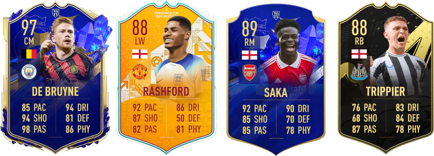 Desde ayer podemos completar un SBC que garantiza un TOTS de la Eredivisie y, si mantienen en FIFA 23 el calendario del año pasado, hoy podría llegar otro para el Equipo de la Comunidad. Pero supongo que muchas personas estarán esperando al Equipo de la Temporada de la Premier League y ojo porque, según parece filtrar la cuenta de Twitter @FIFA23Leaked_, Marcus Rashford, Kevin De Bruyne, Bukayo Saka y Kieran Trippier formarían parte de él.