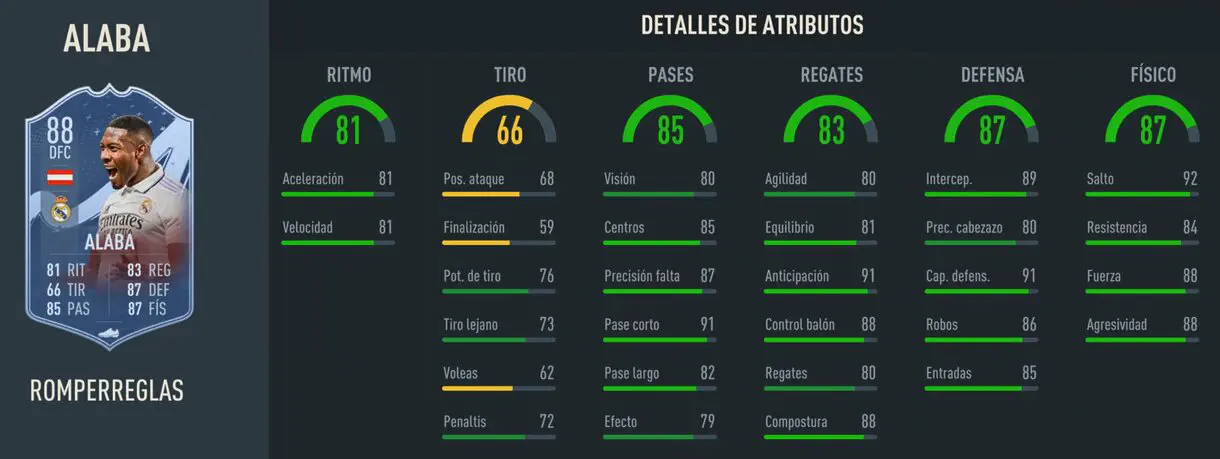 El ítem de Alaba Rulebreakers que prioriza su físico llega a 88 en fuerza, mientras que el otro baja seis puntos menos. Aunque en los dos casos, es muy probable que esa stat parezca bastante menor en el campo. Porque como dijimos antes, su escaso 1'80 de altura pasará factura en ciertas situaciones. Por lo que no desentonará en el cuerpo a cuerpo, pero tampoco mostrará la contundencia de muchos de los centrales más fiables de Ultimate Team.