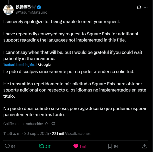 Como te comentaba anteriormente, el director del videojuego Yasumi Matsuno comentó en redes sociales este mismo tema, dejándonos con un mensaje que sin duda alguna, se ha ganado el aplauso de la comunidad y con mucha razón, este dice así: "Les pido disculpas sinceras por no poder atender su solicitud. He transmitido repetidamente mi solicitud a Square Enix para obtener soporte adicional con respecto a los idiomas no implementados en este título. No puedo decir cuándo será eso, pero agradecería que pudieras esperar pacientemente mientras tanto."