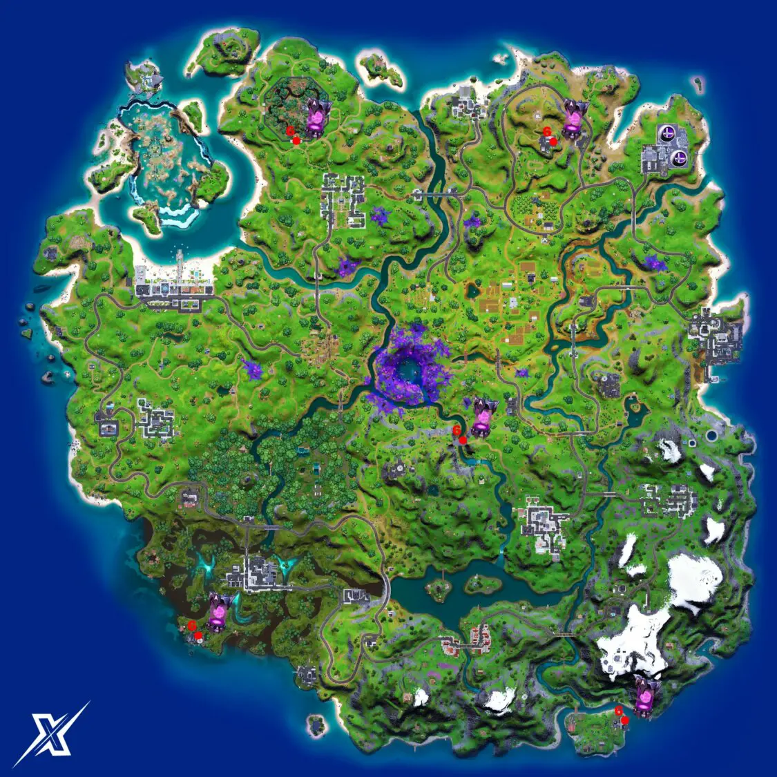 Así pues, ha sido el leaker conocido como XTygerHyperX aquel que ha lanzado al aire un mapa en el que podemos ver cuáles son todas las ubicaciones concretas de cada uno de los artefactos de la skin Kymera de Fortnite. Os dejamos con el mismo a continuación: