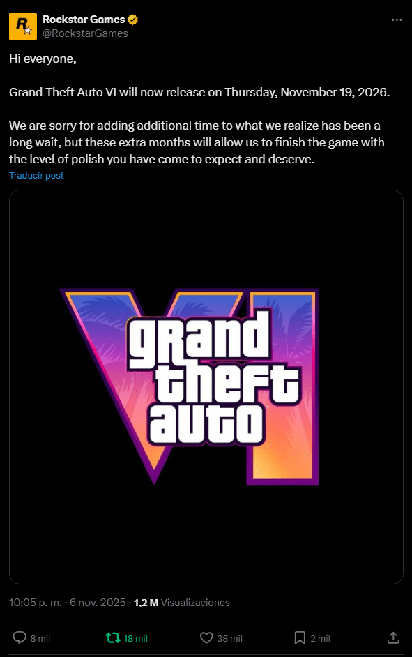 "Hola a todos, Grand Theft Auto VI se lanzará ahora el jueves 19 de noviembre de 2026. Lamentamos añadir tiempo adicional a lo que sabemos que ha sido una larga espera, pero estos meses extra nos permitirán terminar el juego con el nivel de calidad que ustedes esperan y merecen. Queremos agradecerles nuevamente su paciencia y apoyo. Si bien la espera será un poco más larga, estamos muy emocionados de que los jugadores puedan experimentar el extenso estado de Leonida y regresar a la moderna Vice City."