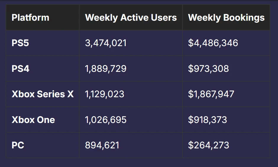 Como podemos ver, en total unos 10 millones de usuarios juegan semanalmente a GTA Online. De ahí, la mayor parte de los jugadores pertenece a PS5, siendo casi 3,5 millones de usuarios. Y como podéis ver, en último lugar se encuentra la versión de PC, que no llega al millón de usuarios.