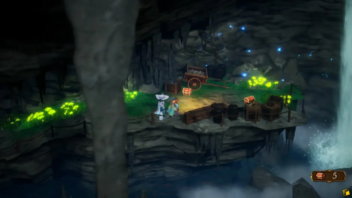 Nos vamos ahora a hablar con el posadero, quien nos dará un cachopo, así que ya podemos dárselo a Trufo justo donde estaba. De paso, nos enseñará a derribar árboles, algo que puede ser útil en el futuro. Al cruzar el río, gira a la derecha y abre el cofre que hay ahí con trampa y 2 luces protectoras. Sigue tu camino hasta cruzar por otro puente y, después, giramos a la izquierda para abrir otro cofre con 1 vara terrestre. Al avanzar un poco, habrá una nueva cinemática y así comenzará el Capítulo 2.
