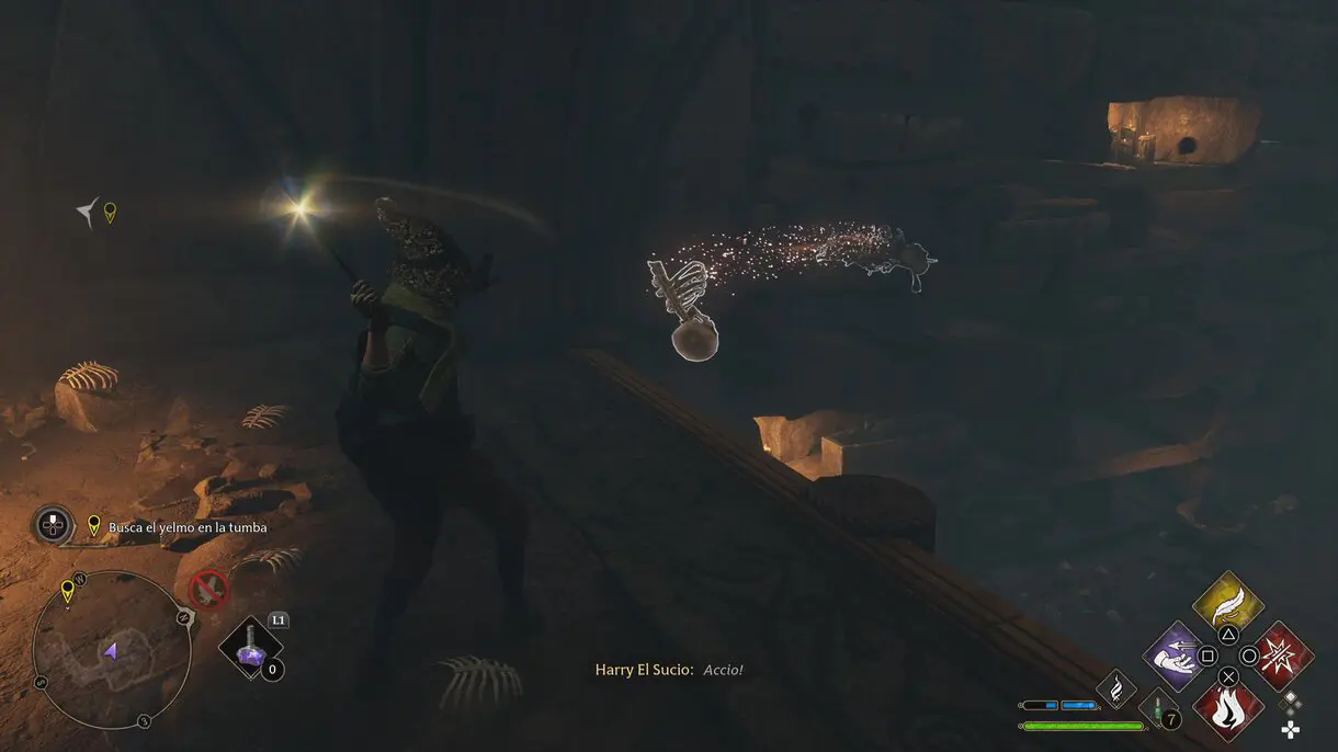 Si sigues avanzando por la mazmorra y vas a la derecha en lugar de a la izquierda, llegarás a una sala donde debería haber un puente que no está y un par de pedestales esqueléticos a los lados. Pues bien, tendrás que usar el hechizo Accio sobre los dos montones de huesos que habrá en la sala y colocarlos sobre los pedestales para que se forme el puente con el que podrás cruzar. Aquí solo encontrarás un cofre secundario, pero creo que es importante explicar cómo funciona dado que te encontrarás con este tipo de puzle muchas más veces en Hogwarts Legacy.