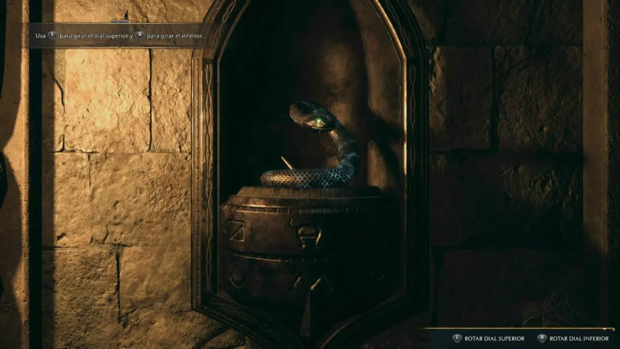 Usa Lumos para ver mejor, y aquí tendrás que girar, habrá puertas cerradas con unos símbolos y cerca habrá un mecanismo que si lo activas, podrás girar unas ruedas que también tienen símbolos, pero debes hacerlo rápido. Tan solo tienes que fijarte en que los símbolos que coloques en el mecanismo coincidan con los símbolos de la puerta que quieres que se abra, así podrás ir abriéndote paso.