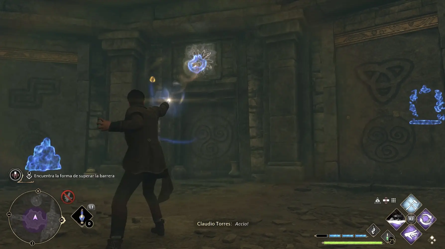 Llegarás en un punto en el que tendrás que hablar con Sebastian y, tras ello, tendrás que coger unos esqueletos con Accio y colocarlos en la puerta que ves en la imagen justo debajo. Si te falta algún esqueleto, lo encontrarás en una de las tumbas que tienen un tirador, donde puedes usar Accio para abrirlas.
