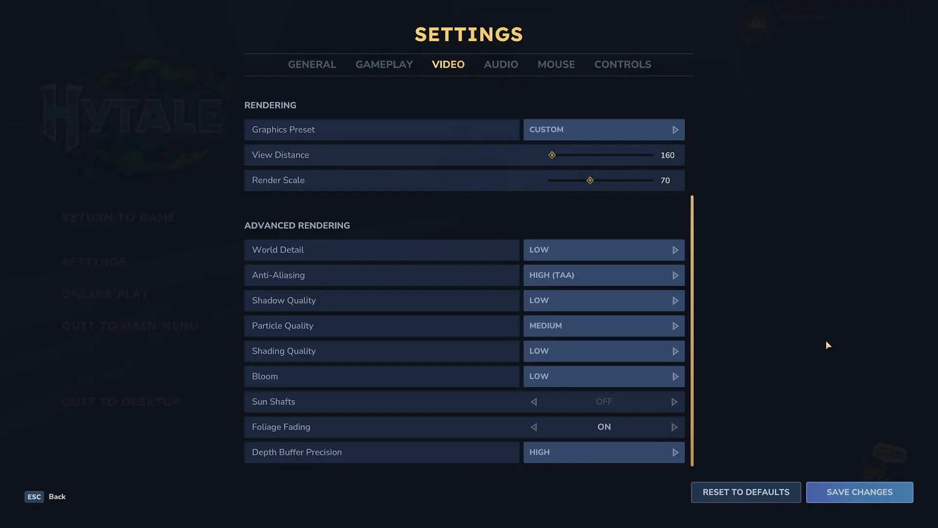 Para ajustar la configuración gráfica de Hytale, debes pulsar Escape para entrar en el menú de pausa y acudir al menú de ¨Settings¨. Desde allí, tendrás que acceder a la sección llamada ¨Video¨ y dejar los ajustes como los muestro en la siguiente lista: