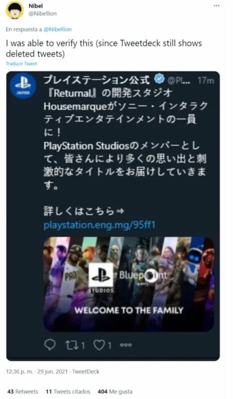 En caso de que exista duda, la imagen no se trata de montaje de tercero alguno, pues Nibelion ha podido corroborar el anuncio por parte de PlayStation Japón dado que Tweetdeck no elimina los tuits una vez han aparecido en el timeline del usuario. Así lo veréis en su tuit: